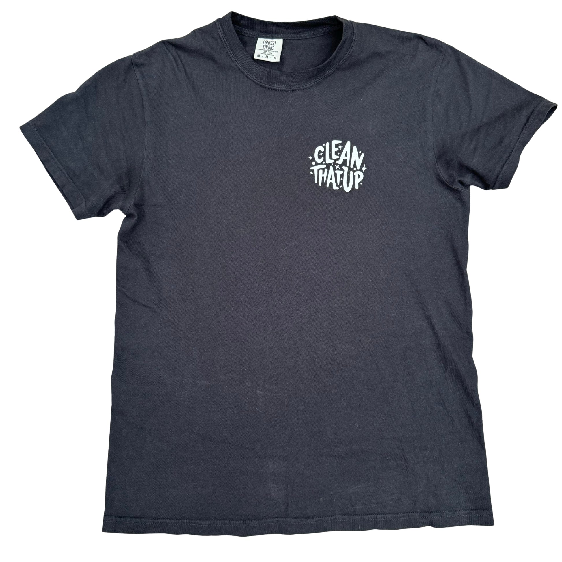 Join the squad—the Clean Squad! This bold black tee features a small white Clean That Up logo on the front chest and everyone's favorite cleaning hero, Spritzy, leading the charge on the back with Clean Squad proudly arched overhead. Printed on a super-soft Comfort Colors® 100% cotton shirt and hand screen printed for durability and detail, this shirt is made for every proud fan of Clean That Up!