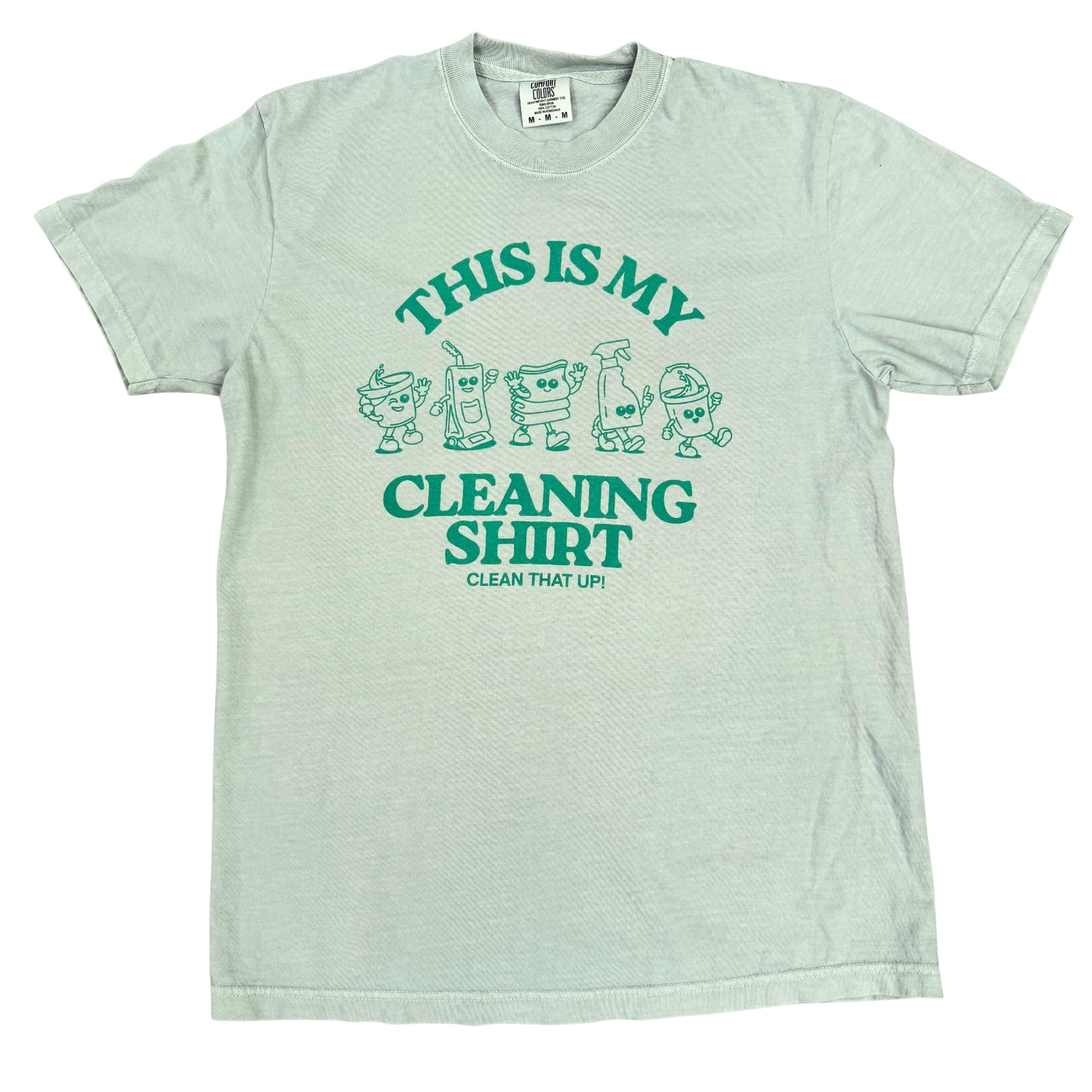 This Is My Cleaning Shirt! This playful mint green tee features bold green lettering and a lineup of your favorite Clean That Up character, ready to tackle any mess with style. Printed on a super-soft Comfort Colors® 100% cotton shirt and hand screen printed for quality that lasts, it’s the perfect uniform for your next deep clean, Sunday reset, or spring cleaning spree. Throw it on, roll up your sleeves, and let everyone know: you're here to Clean That Up.